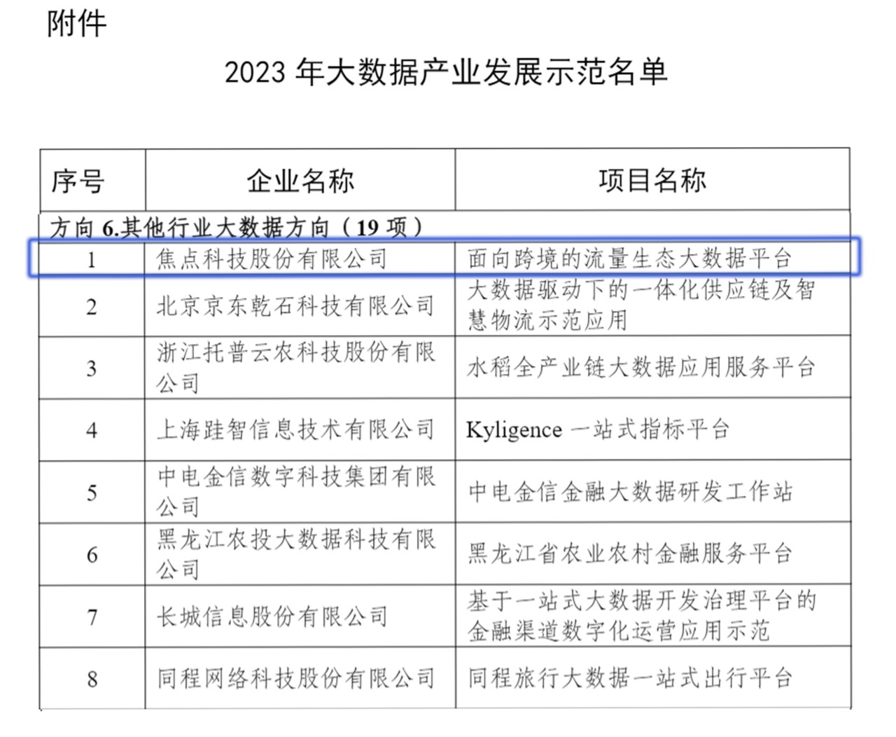 焦點科技入選工信部2023年大數(shù)據(jù)產(chǎn)業(yè)發(fā)展示范名單